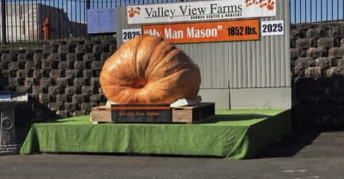 Drum Roll Please! The 2025 Giant Pumpkin has arrived! All 1,852 lbs of him! Meet “My Man, Mason”! Now presiding over the Valley View Farms Pumpkin Patch for the 2025 Halloween season.