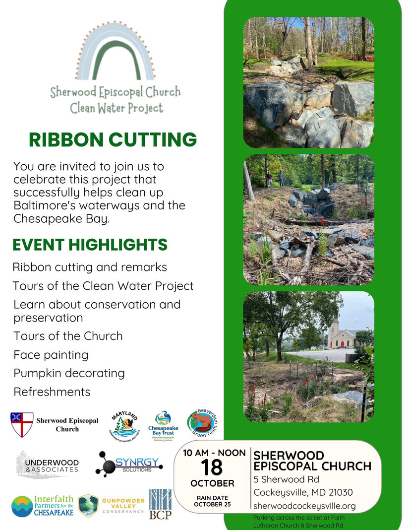 Sherwood Episcopal Church will hold a ribbon cutting on October 18 from 10 am to noon to mark the installation of its Clean Water Project, an initiative designed to combat the effects of storm water runoff flowing down Sherwood Hill through the church’s campus, causing extensive erosion on the property, flooding and hazardous conditions for motorists and business owners along York Road, and pollutant contamination of the local drinking water supply. The ribbon cutting event will include remarks from the Rev. Nancy H. Hennessey, Rector of Sherwood Episcopal Church, and others; tours of the Clean Water Project; tours of the church building; facepainting and pumpkin decorating; and information tables hosted by Sherwood’s partners in the project.