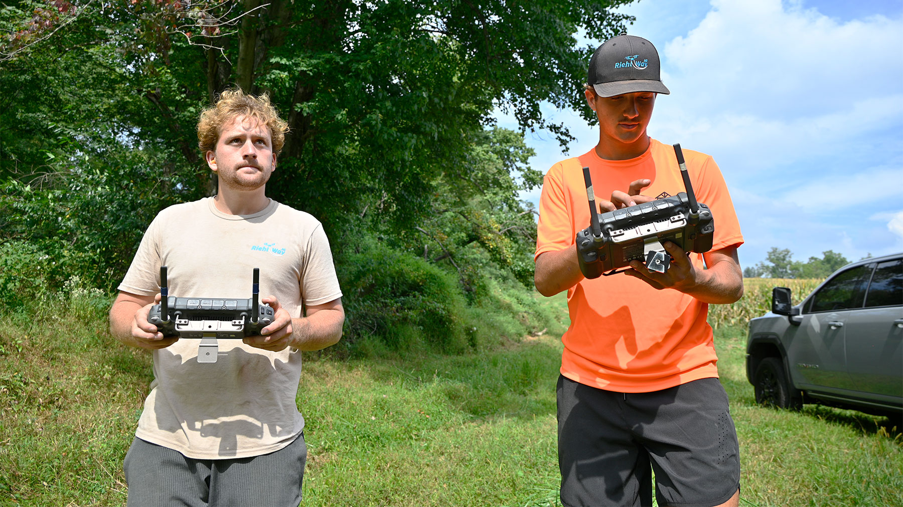SKY-HIGH EXPECTATIONS: David Stoltzfus (left) and Matthew Riehl man their drones doing an interseeding job at a farm in Jarrettsville, Md. They, along with Matthew’s brother, Ephraim, started RiehlWay Ag last year in New Holland, Pa. They have high expectations for their drone business. Chris Torres
