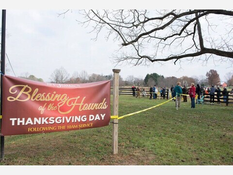Each year on Thanksgiving Day, we begin with a service in the church at 10 a.m. Afterwards, the clergy, choir, and congregation process across the road to the field where the horses, riders, and hounds are gathered.