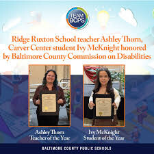 Towson, MD – The Baltimore County Commission on Disabilities has named as its 2025 Teacher of the Year Ashley Thorn, a staff development teacher at Ridge Ruxton School. Ivy McKnight, a Grade 11 student at George Washington Carver Center for Arts and Technology, has been named as the