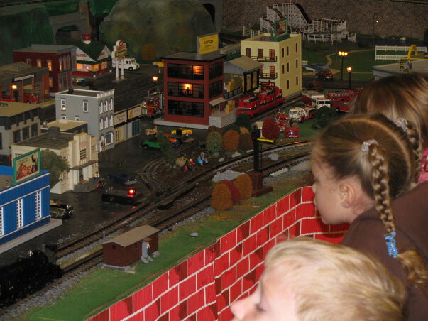 A portion of the Fire Museum of Maryland's train garden, complete with Baltimore-area businesses, working fire engines, and multiple trains.