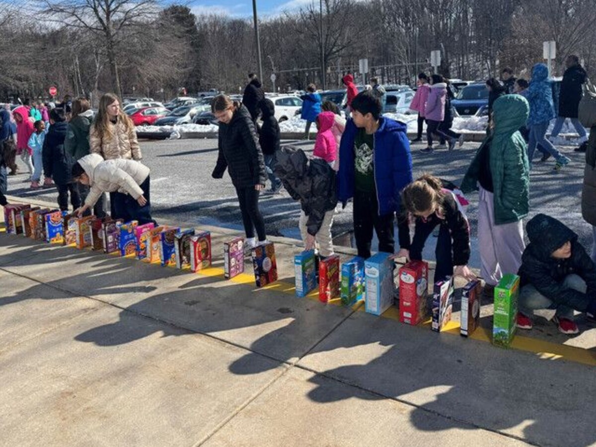 West Towson Grade 4 students calculated that based on an approximate 103.7-meter distance between the schools and the need for at least 3 inches between each box they would need 475 boxes of cereal. In the end, 687 boxes were collected.