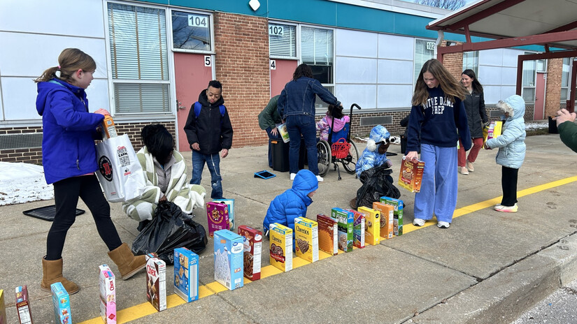 On February 24, Ridge Ruxton School and West Town Elementary School collaborated on a service-learning project to benefit the Maryland Food Bank. Students from both schools, led by Sherri Fisher, Ridge Ruxton’s community school facilitator, and Kristen Zdon, a Grade 1 teacher and Student Government Association advisor at West Towson, lined up more than 650 boxes of cereal like dominos connecting their schools’ front doors and then set off a chain reaction knocking each box down.